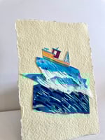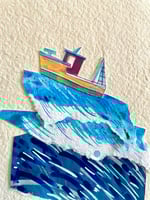 A small original artwork made from hand painted papers and an illustration of a fishing boat out on the swell of the high sea . Perfect for a lover of the ocean perhaps riding the waves or fishing in calm or high seas.