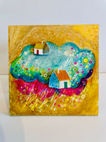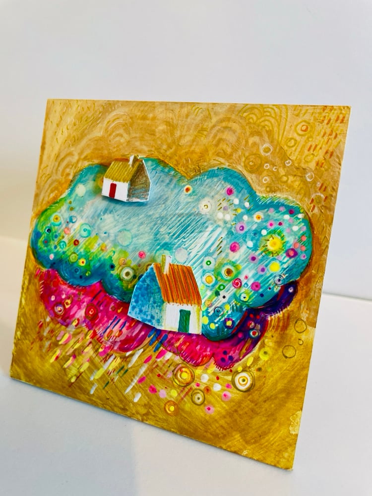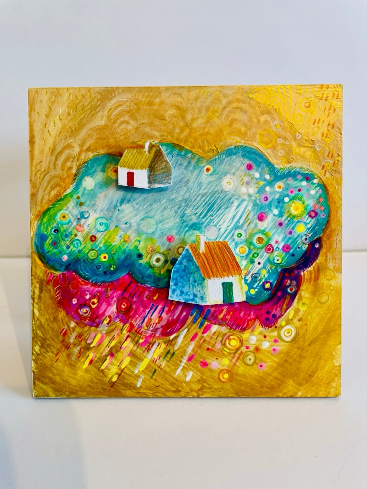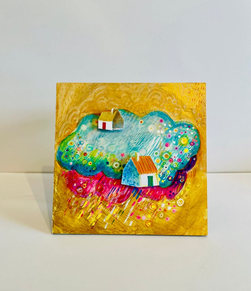 This artwork is mixed media and collage on clay board. The image is of tiny houses on colourful clouds in golden patchowrk skies. The work is 10x10cms